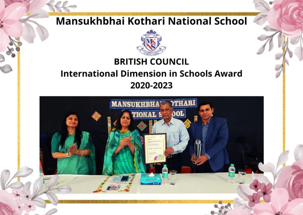 Mansukhbhai Kothari National School has been successful in achieving the British Council, International Dimension in Schools Certificate (IDS) for the period 2020-23. Receiving this prestigious award is a fantastic achievement and a credit to all involved in the project. The IDS certificate and trophy was received by Ms. Varsha Kokil – Principal, Ms. Arti Kothari – Chairperson, Mr. Pradeep Shrivastava – Trustee, Mr. Mayur Shah- Director